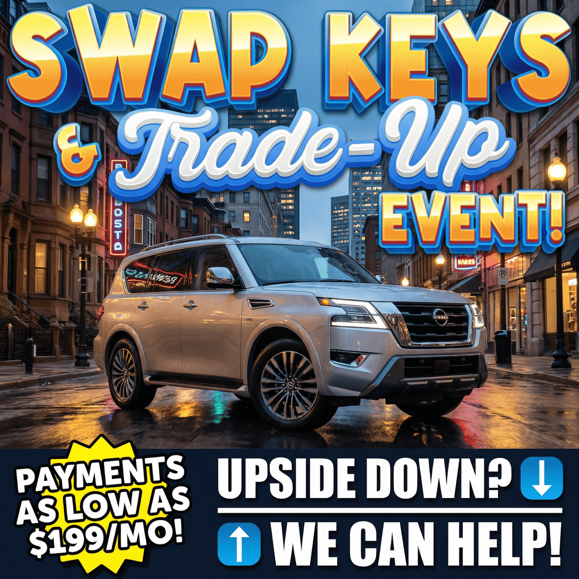 Focused on customers who are upside down or just tired of their current ride. "Upside down? We can help!" combined with low payment messaging ($199/mo type hooks) gets people thinking about upgrading when they assumed they couldn't. We handle the negative equity objection right in the ad.